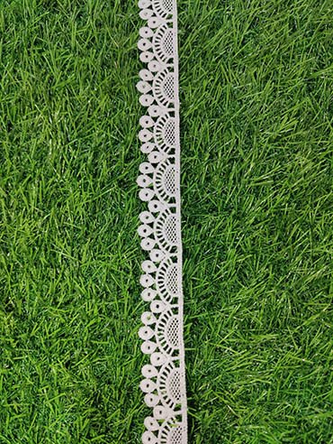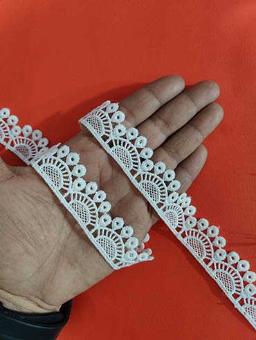 The white crochet lace trim features beautifully detailed floral motifs combined with a soft scalloped edge for a graceful and premium finish. Crafted using fine-quality threads, this lace is lightweight, flexible, and comfortable for all types of fabric applications. Its elegant floral pattern adds a classic charm, making it ideal for both traditional and contemporary designs. Perfect for designers and manufacturers looking for refined detailing